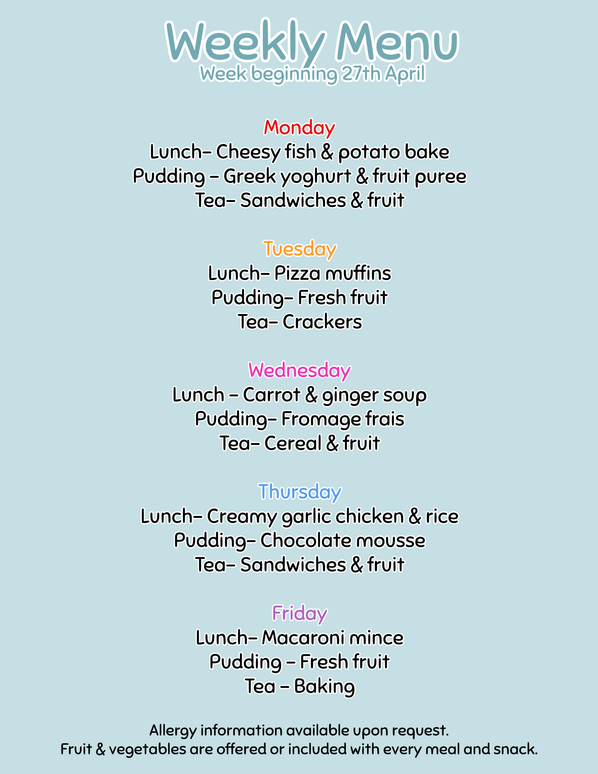 Our weekly menu is carefully planned to provide nutritious and delicious meals for your little ones. Each meal and snack is designed to support your child's growth and development, offering a variety of flavours and nutrients.